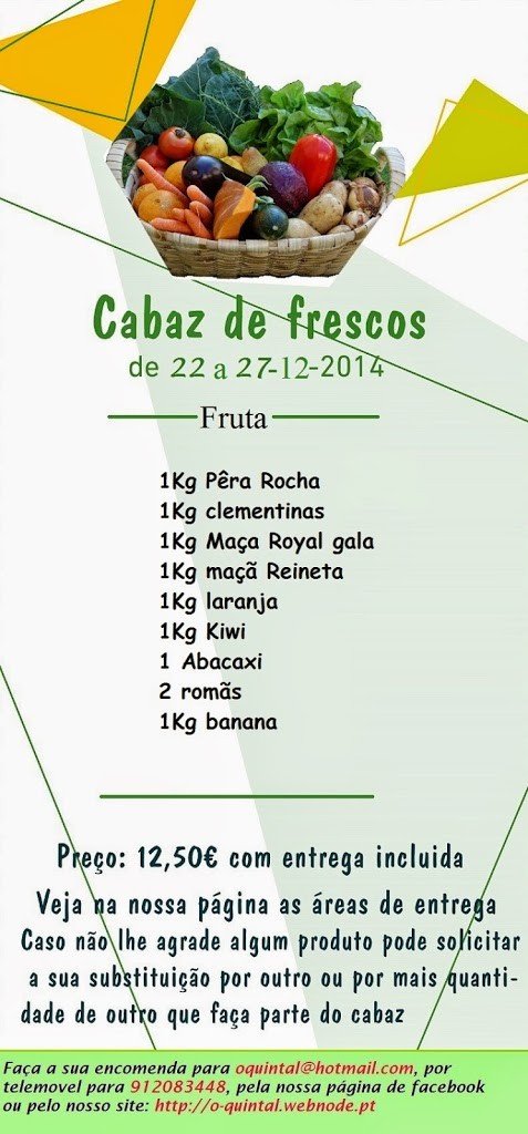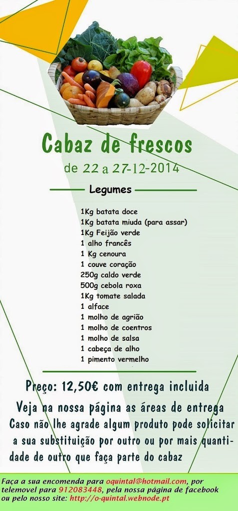 Pode encomendar via email (oquintal@hotmail.com) ou através do site (www.o-quintal.com) no dia anterior ao que pretende receber o cabaz, até às 18h. O cabaz é diferente todas as semanas e o seu conteúdo é divulgado todas as sextas na página do facebook (www.facebook.com/oquintaldequeluz) e no site (www.o-quintal.com). Como já referido os cabazes podem ser compostos apenas por fruta ou legumes ou mistos (metade fruta, metade legumes) e o preço é de 12,50€ e INCLUI A ENTREGA! Quem me dera que isto existisse aqui na Alemanha... Com produtos portugueses, claaaaro!